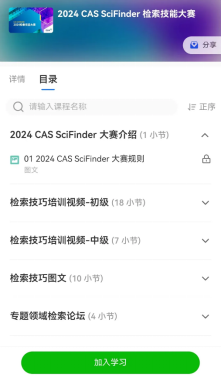 2. 关注微信公众号“ACS美国化学会”, 点击进入“SFn大赛”菜单,点击底部按钮,填写注册信息后即可进入课程学习 (如下图):
