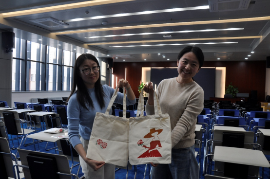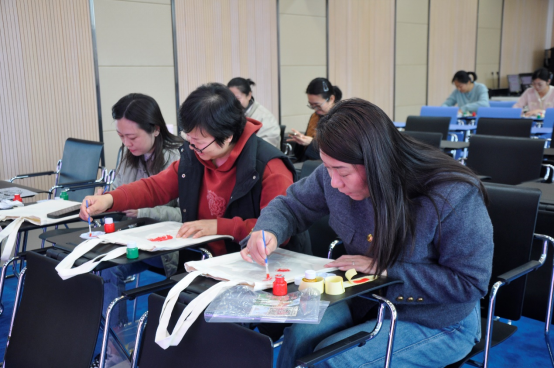 在热烈的氛围中,备受期待的DIY 帆布包环节拉开帷幕。报告厅瞬间化身为创意工坊,女职工们纷纷拿起画笔、颜料与各类装饰材料,全身心投入到帆布包的创作中。她们三两成群,热烈地交流创意,分享绘画技巧。有的女职工以优雅的花卉为主题,细腻地勾勒出花朵的娇艳姿态;有的则用活泼的卡通形象,展现出俏皮可爱的一面;还有人将自己对生活的美好期许,用文字与图案巧妙地融合在帆布包上。现场欢声笑语不断,大家相互欣赏作品,彼此称赞鼓励,充分享受着创作的乐趣。