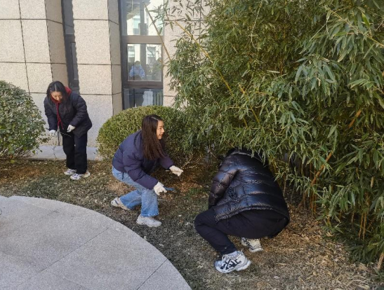 经过所有人员的辛勤付出和共同努力,图书馆内庭院环境得到了极大地改善和提升。原来存在的杂草、枯枝败叶等都被清理得一干二净,整个庭院显得更加整洁、开阔。新栽种的树苗挺拔有力,仿佛在向人们展示着图书馆的活力和希望;修剪过的树枝竹枝形状规整,为中庭增添了几分艺术的美感。